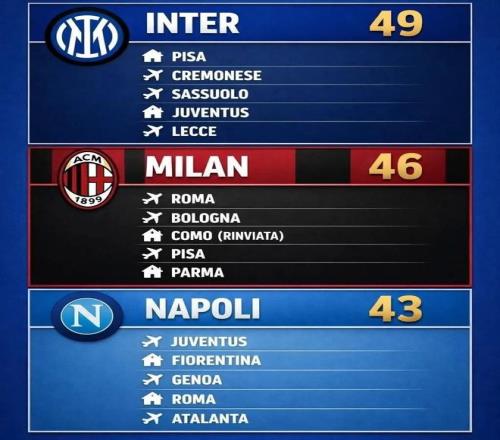 AC米蘭則連續(xù)對陣羅馬、博洛尼亞和科莫三支爭奪歐戰(zhàn)資格的球隊,另外比薩和帕爾馬這樣的弱旅對于紅黑軍團也可能是“溫柔陷阱”,上半程球隊多次劫富濟貧,在弱隊身上丟分。而那不勒斯本輪客場挑戰(zhàn)尤文,之后客戰(zhàn)羅馬與主場對陣亞特蘭大的三場比賽并不好踢,另外佛羅倫薩和熱那亞的實力也不容小覷,同樣會給缺兵少將的那不勒斯帶來一定麻煩。