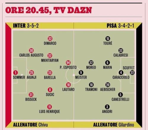 根據(jù)米體的賽前預測,本場國米將繼續(xù)進行一定的陣容輪換。上一場歐冠對阿森納,勞塔羅和巴雷拉提前被換下場,其實就是為了這一場做準備。勞塔羅和皮奧聯(lián)袂搭檔鋒線,“皮勞組合”經(jīng)過多場比賽驗證效果不錯,特別是皮奧在前場的支點作用為勞塔羅創(chuàng)造了很多進攻機會。中場巴雷拉出任后腰,連續(xù)出戰(zhàn)的澤林斯基終于迎來輪休,恰爾汗奧盧還沒回歸,他可得省著點用,姆希塔良重回首發(fā),上一場對陣阿森納表現(xiàn)不錯的蘇契奇則再次出戰(zhàn)。兩邊翼衛(wèi)迪馬爾科和恩里克基本沒有疑問,阿坎吉、比塞克和奧古斯托搭檔后防線,巴斯托尼輪休。