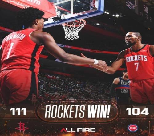而火箭隊在第2天馬上就來到底特律和活塞隊對決。不過火箭隊很快的走出了前一場失利的陰霾,他們重振旗鼓,重新用最好的狀態(tài)和活塞隊較量。本場比賽雖然有多位球員因為受傷不能出戰(zhàn),比如說范弗里特、亞當(dāng)斯、伊森和芬尼史密斯。然而,火箭隊靠著僅剩的殘陣,還是戰(zhàn)勝了活塞隊,拿到了一場相當(dāng)寶貴的勝利,穩(wěn)住了西部第四的排名沒有讓湖人隊和太陽隊超越。