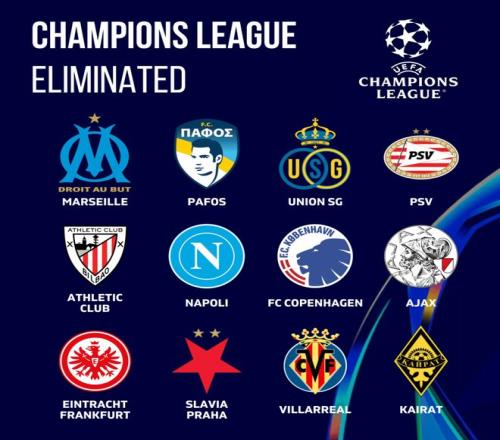 此外,還有12支球隊(duì)位列積分榜前24名之外被淘汰出局,退出了本賽季歐冠的爭(zhēng)奪。