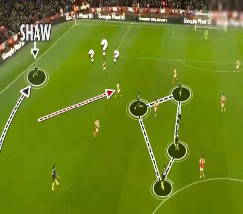 曼聯(lián)邊衛(wèi)盧克·肖和迪奧古·達(dá)洛在外側(cè)跑位,迫使阿森納邊鋒不得不跟人,這樣的牽制,讓紅魔中場(chǎng)始終多出一人。