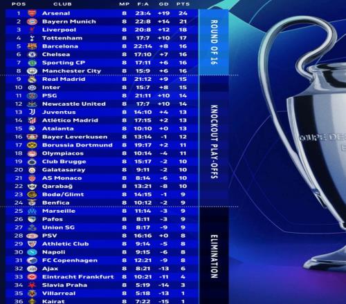 北京時間1月29日,2025-26賽季歐冠聯(lián)賽階段末輪18場角逐全部結(jié)束。而本賽季歐冠直通16強的8支隊伍、參加淘汰賽附加賽的16支隊伍也全部出爐。