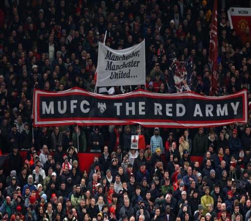 當(dāng)?shù)貢r(shí)間2025年12月30日,英國(guó)曼徹斯特,老特拉福德球場(chǎng),英超比賽前,曼聯(lián)球迷舉著橫幅。視覺(jué)中國(guó) 圖