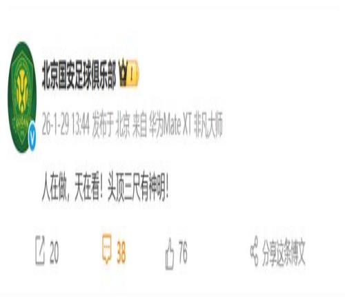 1月29日中午,北京國安足球俱樂部發(fā)布微博:人在做,天在看!頭頂三尺有神明!
