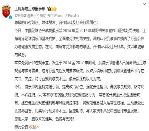 周四,中國足協(xié)正式公布受處罰俱樂部名單,上海申花、上海海港兩家俱樂部公開道歉。