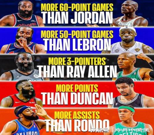 今日,美國知名體育媒體《Clutchpoins》發(fā)布了一組關于快船球星詹姆斯哈登與5位歷史級球星的幾項生涯數據對比。圖中顯示,哈登生涯60+場次(3次)多于邁克爾喬丹;哈登生涯50+場次(25次)多于勒布朗詹姆斯;哈登生涯三分命中數(3306記)多于雷阿倫;哈登生涯總得分(28780分)多于蒂姆鄧肯;哈登生涯總助攻(8665次)多于拉簡隆多。值得一提的是,哈登也是歷史上唯一一位拿過3個得分王和2個助攻王的球員。