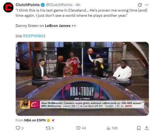 勒布朗的前隊(duì)友丹尼-格林在ESPN的節(jié)目中時(shí)說道:我覺得這場(chǎng)比賽是詹姆斯在克利夫蘭的最后一場(chǎng)比賽了。他之前一次又一次證明我的分析的錯(cuò)的,可這次我實(shí)在是想象不到勒布朗還能再打一年的情景,畢竟他已經(jīng)41歲了。