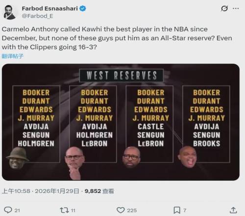 北京時間1月29日,TNT天團(奧尼爾、巴克利、肯尼-史密斯和厄尼-約翰遜)選擇全明星西部替補,快船球員倫納德0票??齑浾逨arbod Esnaashari炮轟:“快船過去19場16勝3負,倫納德是過去一個月聯(lián)盟最佳球員,居然沒人選他?”