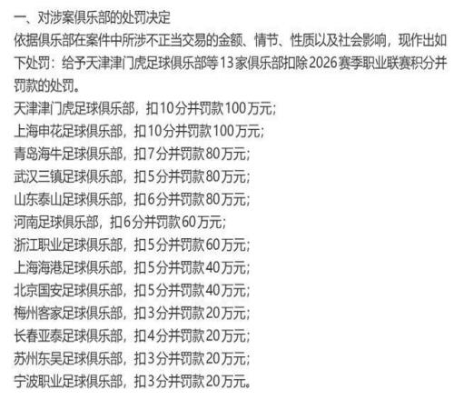 天津津門虎、上海申花等13家職業(yè)俱樂部集體領(lǐng)罰,或被扣除2026賽季積分并處以罰款,伴隨73名從業(yè)人員終身禁足,正式成為了令人觸目驚心的公開現(xiàn)實(shí)!