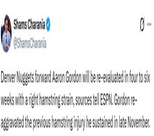 北京時(shí)間1月30日,據(jù)名記Shams報(bào)道,消息源透露,丹佛掘金隊(duì)前鋒阿隆-戈登因右腿筋拉傷,將在四至六周后接受傷情復(fù)查。此次傷病是他去年11月下旬舊傷的復(fù)發(fā)。這意味著他至少要缺席4-6周,掘金再遭重創(chuàng),約基奇因傷目前尚未回歸。