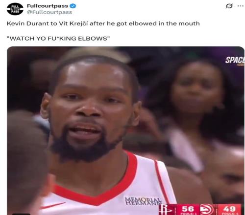 期間杜蘭特對著克雷伊奇說道:“注意你的肘部”。
