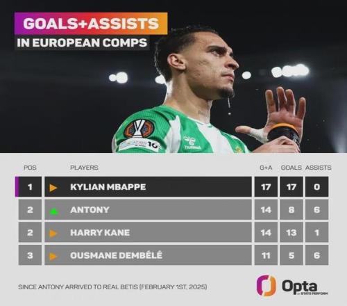 自2025年2月1日加盟皇家貝蒂斯以來,安東尼在不含預選賽的歐戰(zhàn)中,已經(jīng)直接參與了14粒進球(8球6助攻)。這是什么概念?在整個歐洲足壇的同期數(shù)據(jù)中,只有皇馬的姆巴佩(17球)比他多,甚至與哈里·凱恩持平!