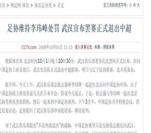 俱樂部隨即發(fā)出最后通牒:若不撤銷對李瑋鋒的追加處罰,將退出中超聯(lián)賽。