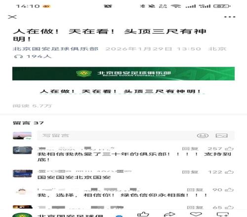 1月29日下午,北京國安官方社交平臺悄然更新一則短訊,措辭凝練如刀,被外界普遍解讀為直面中國足協(xié)的公開表態(tài)。