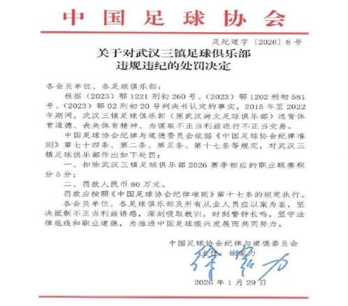 在昨日足協(xié)公布的罰單中,武漢三鎮(zhèn)于2015年至2022年期間,違背體育道德、喪失體育精神、為謀取不當(dāng)利益進(jìn)行不當(dāng)交易,因此被扣除2026賽季中超聯(lián)賽積分5分并罰款80萬(wàn)元。他們也是被扣分最少的中超球隊(duì)之一。