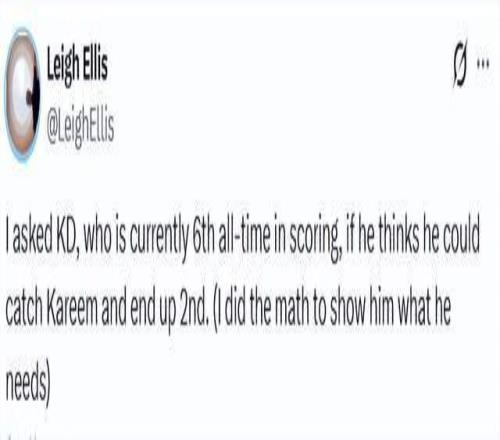 NBA記者埃利斯通過計(jì)算后告知杜蘭特:要想超越賈巴爾,成為歷史得分榜的第二,杜蘭特需要在接下來出戰(zhàn)的268場比賽中,保持場均25分的水準(zhǔn)。