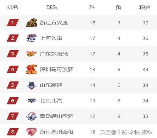 排在積分榜第5名的是山東隊(duì),他們的戰(zhàn)績(jī)?yōu)?4勝6負(fù),不過(guò),由于少賽一輪的緣故,山東隊(duì)在排名上稍微吃虧,目前只能暫居積分榜第5名。而北京隊(duì)則緊隨其后,排在積分榜第6名,他們的戰(zhàn)績(jī)?yōu)?3勝8負(fù),與深圳隊(duì)一樣。積分榜第7名則是青島隊(duì),他們的戰(zhàn)績(jī)?yōu)?2勝9負(fù),浙江隊(duì)與青島隊(duì)一樣,也是12勝9負(fù),他們則排在積分榜第8名。目前,積分榜第4-8名的球隊(duì),他們之間的差距非常小,任何的一場(chǎng)勝負(fù),都會(huì)影響到多支球隊(duì)的排名。