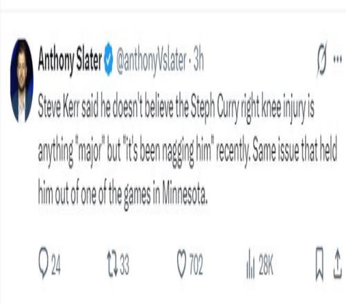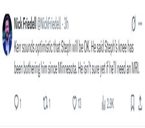 另一勇士隊記尼克-福爾德則透露,雖然庫里的右膝已經(jīng)不適一周,但勇士隊內(nèi)還沒有確定是否進(jìn)行MRI檢測,一切要看庫里第二天起床后的感覺。