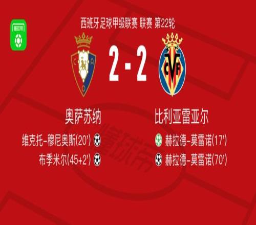 北京時(shí)間1月31日西班牙足球甲級(jí)聯(lián)賽 聯(lián)賽 第22輪,奧薩蘇納主場(chǎng)對(duì)陣比利亞雷亞爾。奧薩蘇納維克托-穆尼奧斯破門(mén),布季米爾破門(mén)。比利亞雷亞爾赫拉德-莫雷諾梅開(kāi)二度。最終比分奧薩蘇納 2-2 比利亞雷亞爾。
