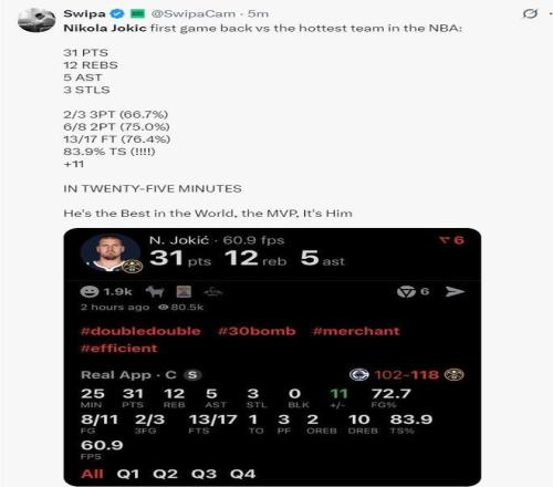 這才是MVP!傷停32天復(fù)出24分鐘31+12+5約基奇攻防無解被盛贊