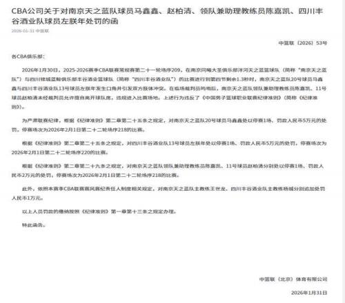 2月1日上午,CBA公司發(fā)布公告,因臨近比賽結(jié)束時(shí)發(fā)生沖突,同曦男籃球員馬鑫鑫被停賽1場且罰款人民幣5萬元;四川男籃球員左朕年被停賽1場且罰款人民幣5萬元;同曦男籃領(lǐng)隊(duì)兼助教陳嘉凱、球員趙柏清分別被停賽1場且罰款人民幣2萬元;依照本賽季CBA聯(lián)賽賽風(fēng)賽紀(jì)責(zé)任人制度相關(guān)規(guī)定,同曦男籃主教練王世龍、四川男籃主教練楊城分別被追加處罰人民幣1萬元。