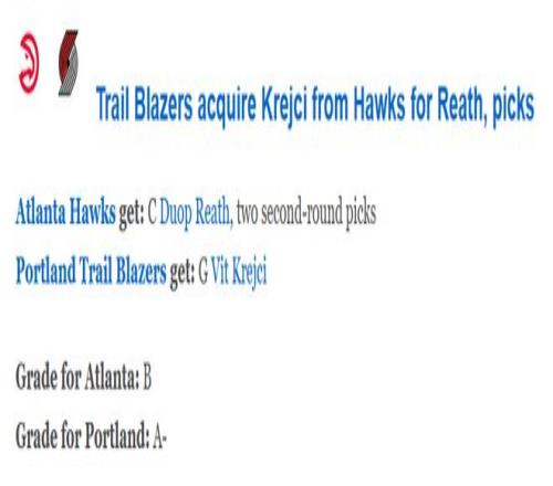 北京時(shí)間2月2日,開(kāi)拓者和老鷹完成了一筆3換1的交易。開(kāi)拓者送出已經(jīng)賽季報(bào)銷(xiāo)的里斯以及兩個(gè)次輪簽(原屬于老鷹的2027年次輪簽以及尼克斯的2030年次輪簽),從老鷹得到射手克雷伊奇。ESPN隨后對(duì)這筆交易進(jìn)行評(píng)級(jí),開(kāi)拓者評(píng)級(jí)是A-,老鷹是B。