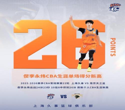 上海新星偰李永煒迎來生涯之夜,他狂轟26分6記三分,創(chuàng)造生涯單場得分新高紀錄,率領上海114-80大勝同曦鞏固聯(lián)賽第二。