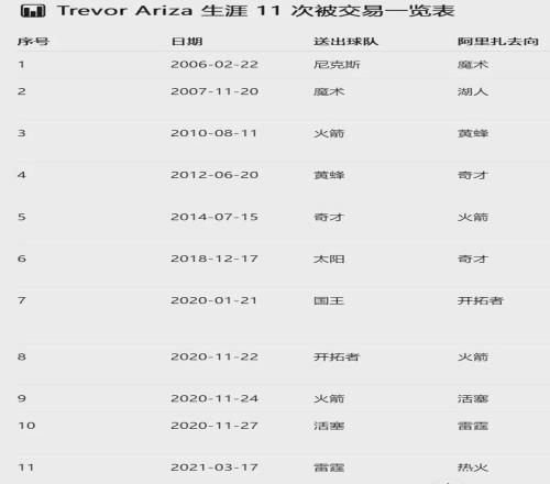 阿里扎至此已經(jīng)被交易了7次,接下來才是真正的顛沛流離:2020年11月17日,開拓者將阿里扎送回火箭;11月19日,火箭又把他送到活塞;11月21日,活塞將阿里扎送到雷霆。短短四天換了四隊(duì)!2021年3月18日,雷霆將其送到熱火。