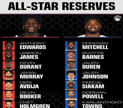 在西部分區(qū),入選的全明星替補(bǔ)球員有明尼蘇達(dá)森林狼隊(duì)的愛德華茲、洛杉磯湖人隊(duì)的詹姆斯、休斯頓火箭隊(duì)的杜蘭特、丹佛掘金隊(duì)的穆雷、波特蘭開拓者隊(duì)的阿夫迪亞、菲尼克斯太陽隊(duì)的布克和俄克拉荷馬城雷霆隊(duì)的霍姆格倫。