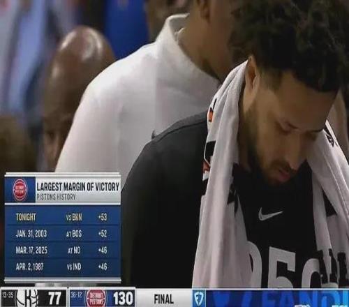 此役活塞贏了53分之多,創(chuàng)造隊史單場最大贏球分差。