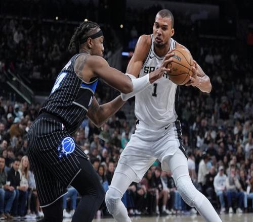 馬刺主場迎戰(zhàn)魔術(shù),馬刺少了卡斯?fàn)枺g(shù)少了小瓦格納,首節(jié)比賽馬刺贏了16分,第二節(jié)魔術(shù)贏了17分反超1分,下半場比賽馬刺重新占據(jù)上風(fēng),最終馬刺112-103擊敗魔術(shù)。文班13中7得到25分8板2助4斷5帽,??怂?4中7得到14分3板10助,哈珀12中6得到15分6板5助,魔術(shù)方面貝恩17中10得到25分4板4助,班凱羅12中6得到19分10板4助。