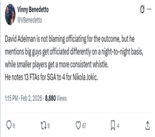 同時他指出本場比賽亞歷山大一人拿到13次罰球,而約基奇僅為4次。
