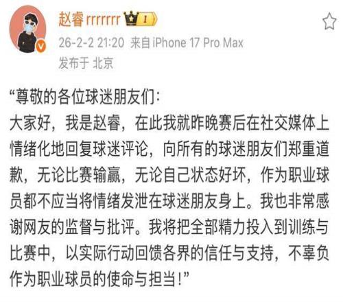 面對(duì)洶涌輿情,趙睿在24小時(shí)內(nèi)火速更新社交動(dòng)態(tài),公開(kāi)致歉:“昨晚賽后在社交媒體上情緒化地回復(fù)球迷評(píng)論,向所有球迷朋友們鄭重道歉。無(wú)論比賽輸贏,無(wú)論自己狀態(tài)好壞,作為職業(yè)球員,都不應(yīng)將情緒發(fā)泄在球迷身上?!?/strong>言辭誠(chéng)懇,態(tài)度明確。這一及時(shí)止損的舉動(dòng),雖未能完全平息爭(zhēng)議,但至少展現(xiàn)了職業(yè)球員應(yīng)有的擔(dān)當(dāng)。