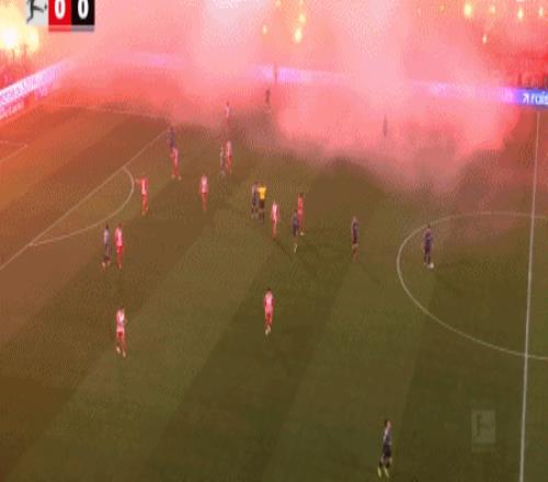 第10分鐘,球迷燃放煙花造成場上煙霧過大,裁判暫時(shí)吹停比賽
