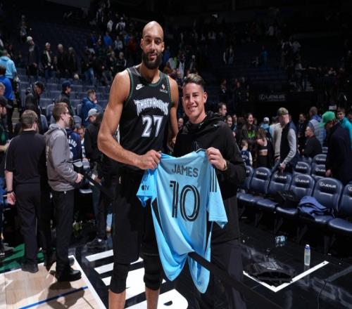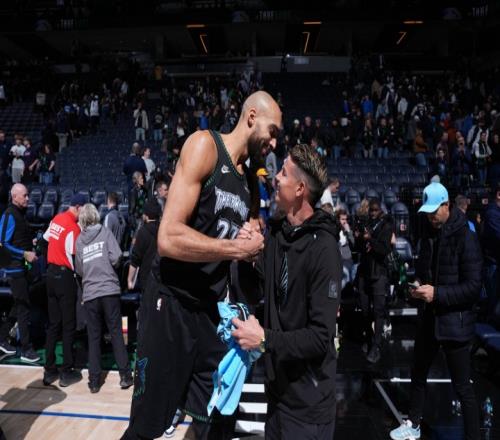 足籃聯(lián)動(dòng)!J羅觀戰(zhàn)森林狼比賽,與戈貝爾寒暄互動(dòng)
