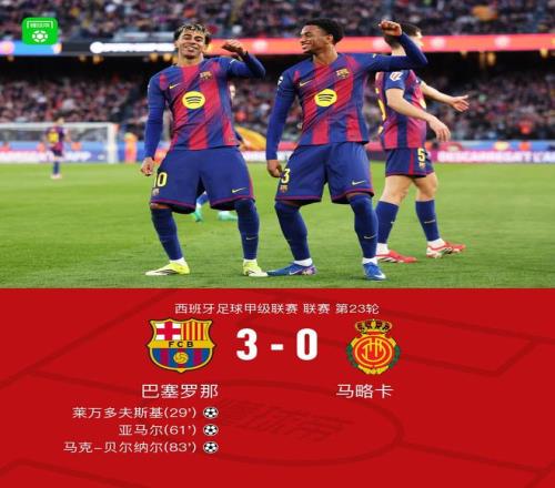 北京時(shí)間2月7日西班牙足球甲級(jí)聯(lián)賽 聯(lián)賽 第23輪,巴塞羅那主場(chǎng)對(duì)陣馬略卡。上半場(chǎng)禁區(qū)內(nèi)球反彈到奧爾莫腿上,萊萬(wàn)調(diào)整后破門(mén)。下半場(chǎng)奧爾莫傳球,亞馬爾轟出一記世界波,之后貝爾納爾突入禁區(qū)冷靜扣過(guò)防守后折射破門(mén)斬獲巴薩一線隊(duì)首球。最終巴薩3-0戰(zhàn)勝馬略卡。