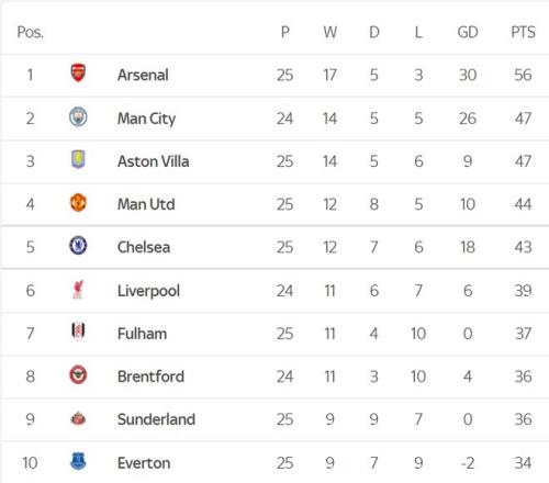 在積分榜上,槍手以56分繼續(xù)排名榜首,暫時(shí)比曼城多出9分。在同時(shí)進(jìn)行的比賽里,維拉以1比1的比分戰(zhàn)平伯恩茅斯,維拉以47分排名第三位。