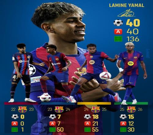 40球40助!18歲亞馬爾為巴薩出戰(zhàn)136場比賽參與80球