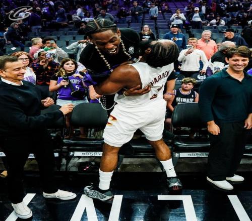 TravisScott現(xiàn)場(chǎng)觀戰(zhàn)哈登騎士首秀,兩人賽后激情相擁