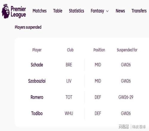 值得一提的是,英超官網(wǎng)同時(shí)顯示,羅梅羅已經(jīng)累積8張黃牌,如果在第32輪之前,累積得到10張黃牌的話,還要自動(dòng)停賽2場(chǎng)。幸運(yùn)的是,由于這次面對(duì)4場(chǎng)停賽,復(fù)出后是第30輪,如果三場(chǎng)比賽內(nèi)沒(méi)有得到2張黃牌的話,即使隨后累積10張也不會(huì)停賽,要累積到15張才要接受處罰。
