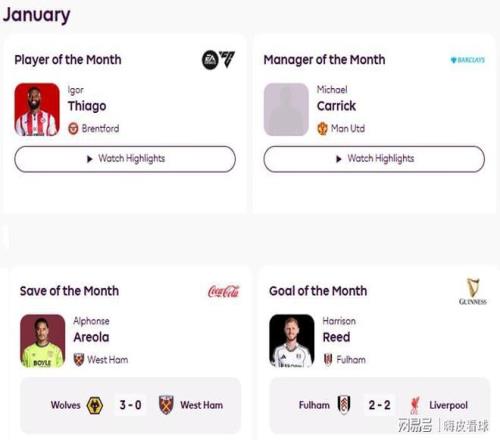 上述三項評選中,曼聯方面均獲得提名,可是多古(2項)、庫尼亞和拉門斯悉數落選,只有1月最佳主教練,由兩連勝的卡里克當選。其余候選名單,包括3連勝的羅塞尼爾,2勝1平1負的戴奇,3勝1平1負的伊勞拉等四名主帥。