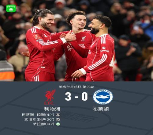 北京時間2月15日英格蘭足總杯 第四輪,利物浦對陣布萊頓。利物浦柯蒂斯-瓊斯破門,索博斯洛伊破門,薩拉赫破門。最終比分利物浦 3-0 布萊頓。