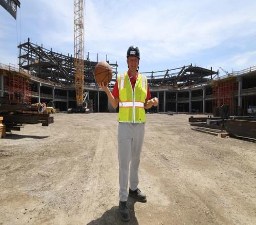 2022年8月的一天,史蒂夫-鮑爾默頭戴黑色建筑安全帽,身穿黃色安全背心,站在工地上的裝卸站臺區(qū)域。當(dāng)時球館區(qū)域的土地還不太平坦,但他完全清楚這里的相關(guān)布局,甚至可以準(zhǔn)確指出客隊(duì)更衣室未來的位置。
