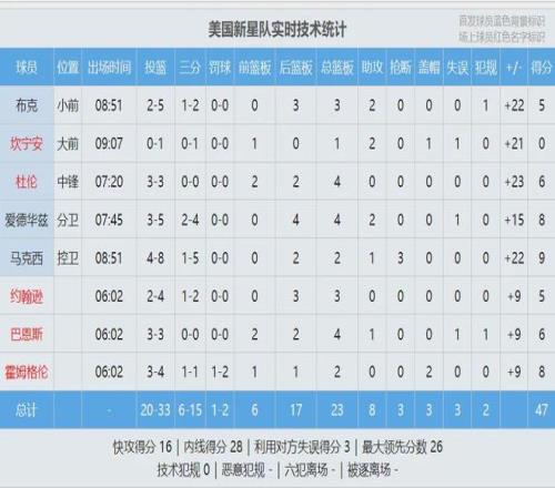 條紋隊和星辰隊會師決賽,條紋隊老將的體力下降,前10次出手全部打鐵。星辰隊開局打出12-1領(lǐng)先到兩位數(shù)。詹姆斯連得5分,愛德華茲連砍8分回應(yīng)。打了半節(jié),星辰隊領(lǐng)先到17分。條紋隊派上五小陣容,依然無法迫近分差。