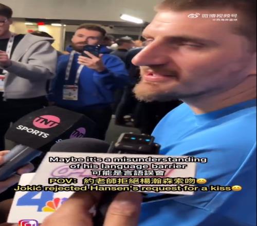 在今天的NBA全明星周末正賽結(jié)束之后,一位中國(guó)記者提問(wèn)了約基奇,“約基奇先生,請(qǐng)問(wèn)一下楊瀚森,中國(guó)球員楊瀚森想要親吻你?”