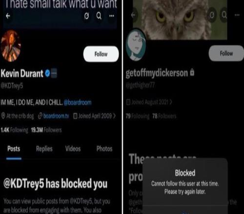 北京時間2月16日,有一位網(wǎng)友在社媒上爆料有一個名為‘getoffmydickerson’的賬號疑似是凱文-杜蘭特的小號,因為杜蘭特的大號與這個getoffmydickerson賬號都將他拉黑了,他就覺得這個getoffmydickerson是杜蘭特小號,而這個getoffmydickerson多次語出驚人。
