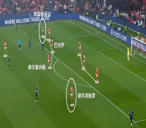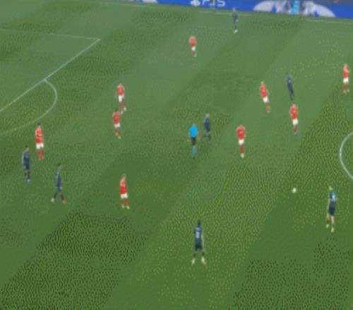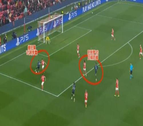 這一波的防守,最初就是邊鋒普雷斯蒂安尼退防到邊后衛(wèi)身側(cè)限制拿球的卡雷拉斯?;蜀R這邊回傳后,本菲卡又讓后腰巴列羅卡在肋部,讓皇馬很難對禁區(qū)內(nèi)發(fā)起進攻。