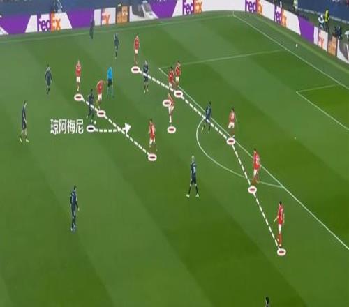 這一次的進攻,最初來自于瓊阿梅尼的遠(yuǎn)射,在被封堵之后,皮球轉(zhuǎn)移到側(cè)翼,隨后傳中球打禁區(qū)后點。