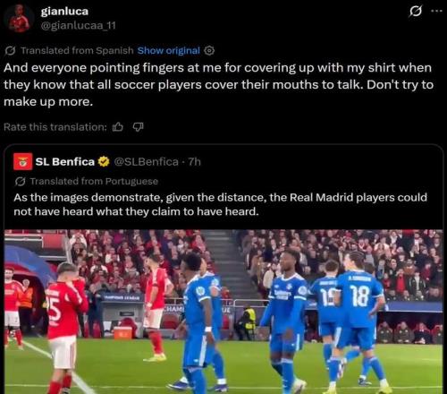 普雷斯蒂安尼的行為引起軒然大波,本菲卡官方在社交媒體發(fā)布了一段比賽切片視頻,并表示皇馬球員不可能聽到他們認為的本菲卡球員說的內(nèi)容。