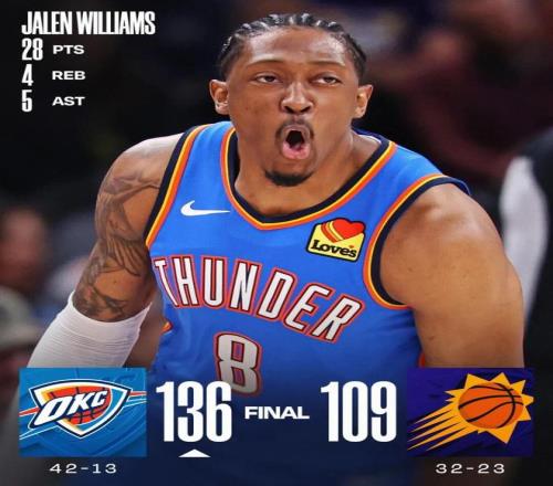 時(shí)間回到全明星之前,雷霆對(duì)陣太陽(yáng)的比賽,這場(chǎng)亞歷山大、米切爾缺席,然后雷霆后場(chǎng)當(dāng)家球星杰威打出了非常出色的表現(xiàn):